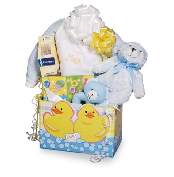 Welcome the new Bundle of Joy with this wonderful gift. Our yellow duck basket holds a matching body suit, bib, burp cloth, bottle, rattle and wooly plush bear.