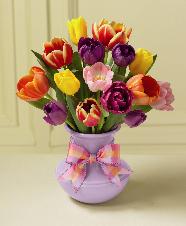 Tulips know Spring has arrived! And they happily get together to share Spring colors - pink and yellow and purple and more - 15 assorted tulips in all! These welcome blossoms are arranged in a sweet lavender ceramic vase with a plaid ribbon bow.