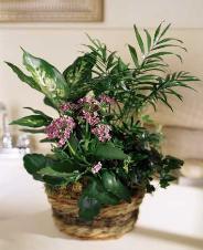 A mix of green and blooming plants in a basket makes a nice presentation and a long lasting gift.