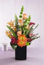 A breathtaking variety of flowers and greens abounds in this sophisticated one-sided bouquet. Peach roses, orange Mokara orchids and Gerbera daisies, hot pink mini Callas and asters are only the beginning. Shades of green are just as varied with Bells of Ireland, Kermit pompons, fern, myrtle and galax leaves. All are beautifully arranged in a black ceramic vase |
